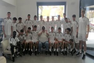 Arriba, Sr. Alberto Ibáñez Granda (preparador físico), RISCO (Alberto Risco Alcántara), ACEITUNO (Marcos Aceituno Pliego), Sr. Gonzalo Cuenca de Blas (entrenador), JAVI ROMANO (Javier Romano Sánchez), JACOBO (Jacobo Ramón Naveros), POL (Pol Fortuny Albareda), MESO (Daniel Mesonero Miguel), HUGO (Hugo Mantecón Gil), HUGO DE LLANOS (Hugo de Llanos García), CRISTIAN (Cristian David Perea Cajiao), Sr. Juan José Crespo Simón (entrenador ayudante), IKER (Iker Gil López), Sra. Patricia Lorenzo Rodelas (A.T.S.), Sr. Carlos Francisco de Asis Gómez Caballero (delegado)