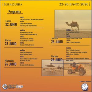 Participar en la DreamCup significa vivir paseo en camello por las dunas, ruta en quad por la playa, surf en el Atlántico, torneo interno de fútbol playa, visita a la Medina Patrimonio de la Humanidad, convivencia con equipos locales y españoles y descubrimiento de una cultura auténtica.
