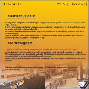 Los jugadores se alojarán en riad u hotel junto a la playa, en un entorno seguro y preparado para grupos.
