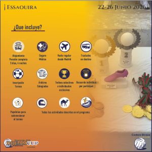 Alojamiento cinco días y cuatro noches, pensión completa, vuelo regular desde Madrid, traslados en destino, seguro médico, inscripción al torneo, árbitros colegiados, trofeos colectivos e individuales exclusivos, recuerdo individual por participación, papeletas para subvencionar el viaje y todas las actividades descritas en el programa.