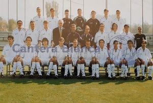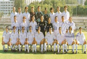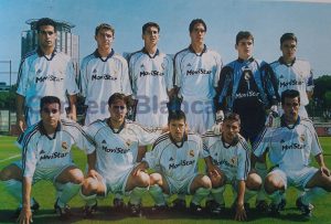 2ª Fila, SESTELO (Sergio Sestelo Guijarro), CÉSAR NAVAS (César González Navas), Sr. Vicente Díaz Calderón (Delegado), Sr. Jorge Alberto Valdano (Director General Deportivo), Sr. Florentino Pérez Rodríguez (Presidente del Real Madrid), Sr. Francisco Buyo Sánchez (entrenador), Sr. José Luis San Martín Rey (preparador físico), Sr. Daniel Martínez Oyamburu (A.T.S.), PAVÓN (Francisco Pavón Barahona), LEO (Juan Francisco Leo Bermejo)