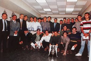 De pie, Sr. Luis Palmero Sagredo (entrenador), Sr. Ángel Vilda Serrano (preparador físico), Sr. Vicente Díaz Calderón (delegado), x, x,x, x, x, x, x, Sr. Lorenzo Sanz Mancebo (Presidente), x, x, x, x, x, x, x,
