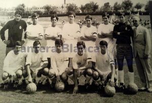 Arriba, el Real Madrid Juvenil B, LARA (Antonio Sanz Lara), GARCÍA AVILES (Eusebio García Avilés), DE LOS MOZOS (Fernando de los Mozos), x, SANZ MAYORAL (Manuel Sanz Mayoral), RIVAS (-), ÁLVAREZ (Antonio Álvarez Ávila), Sr. Francisco Lacuesta Salazar (entrenador), MAÍLLO (Fernando Maíllo Herrero), ROMERO (Manuel Romero Paz), ALIQUE (Juan Alique García), SÁNCHEZ SANZ (Jesús Sánchez Sanz)
