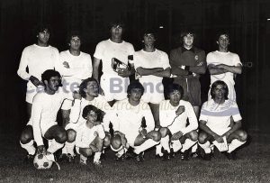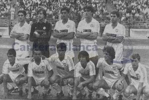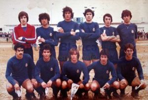 Agachados, Sr. Rafael Guillén Cuesta (entrenador), ALGUACIL (Juan Alguacil Amate), MADERO (Francisco Antonio Madero Jiménez), ORTIZ (Francisco Ortiz Márquez), LÓPEZ MIRÓ (Gregorio López Miró), CID (Juan Carlos Cid González), BERNARDO (Alberto Ricardo Bernardo Murcia), HURTADO (Francisco Hurtado Soler), Sr. Juan Paredes Jr. (utillero).