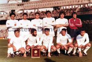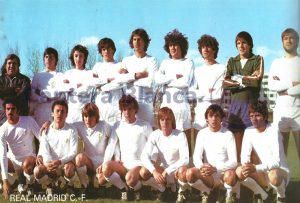Fila intermedia, JUANITO (Juan Antonio Felipe Gallego), BLANCO (Vicente Blanco Brazales), MARTÍN (Ángel Martín González), JOSÉ MANUEL (José Manuel Santos Hernández), Sr. Amancio Amaro Varela (entrenador), CHOLO (José Ángel Ruiz López), SANCHÍS (Manuel Sanchís Hontiyuelo), MÍCHEL (José Miguel González Martín Del Campo), MARÍN (Antonio Luis Marín Moreno)