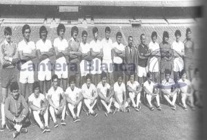Arriba, OCHOTORENA (José Manuel Ochotorena Santacruz), CASTRO (José Manuel García Castro), BERNAL (Miguel Bernal Feito), HERRERO (Enrique Herrero Cuartango), MONTES (José Luis Montes Vicente), CASIMIRO (Casimiro Torres Ibáñez), BALÍN (Cristóbal Machín Fernández de la Puente), PACO (Francisco Machín Fernández de la Puente), Sr. Jesús Paredes Alonso (Preparador Físico), Sr. Juan José Borrachero Doncel (presidente del Castilla C.F.), Sr. Juan José García Santos «Juanjo» (entrenador), BLANCO (Vicente Blanco Brazales), MATÉ (Javier Maté Bernal), MORENO (Juan Moreno Jordán), MIGUEL (Miguel Recio Moya)