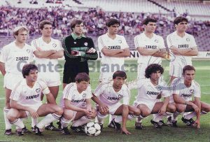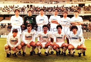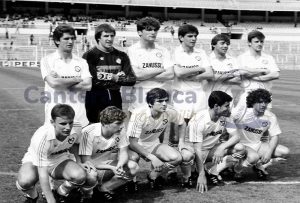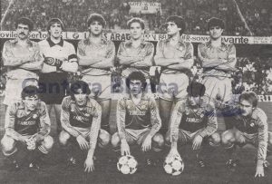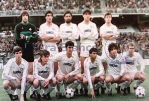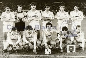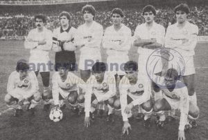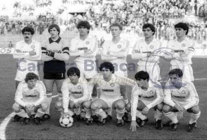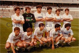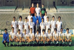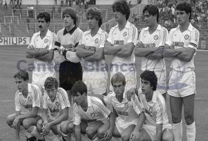 Arriba, PARDEZA (Miguel Pardeza Pichardo), BUTRAGUEÑO (Emilio Butragueño Santos), DE LAS HERAS (José Ángel De las Heras García), SERNA (José Antonio Serna Santos), ELOLA (Francisco Javier Elola Lecuona), OCHOTORENA (José Manuel Ochotorena Santacruz), ORTIZ (Francisco Ortiz Márquez), BLANCO VILA (José Benito Blanco Vila), LÓPEZ UFARTE (Alejandro López Ufarte)