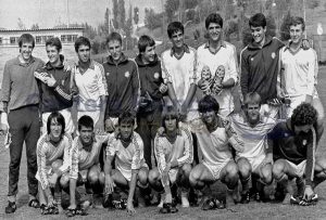 Agachados, BUTRAGUEÑO (Emilio Butragueño Santos), MARTÍN VÁZQUEZ (Rafael Martín Vázquez), SANCHÍS (Manuel Sanchís Hontiyuelo), BLANCO VILA (José Benito Blanco Vila), PARDEZA (Miguel Pardeza Pichardo).
