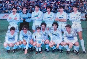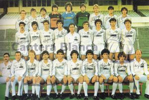 Abajo, MARÍN (Antonio Luis Marín Moreno), SERNA (José Antonio Serna Santos), BLANCO VILA (José Benito Blanco Vila), Emilio Ruiz García  (masajista), PARDEZA (Miguel Pardeza Pichardo), BUTRAGUEÑO (Emilio Butragueño Santos), ELOLA (Francisco Javier Elola Lekuona), ORTIZ (Francisco Ortiz Márquez), MÍCHEL (José Miguel González Martín Del Campo), LÓPEZ UFARTE (Alejandro López Ufarte), Antonio Acedo Parró (A.T.S.)