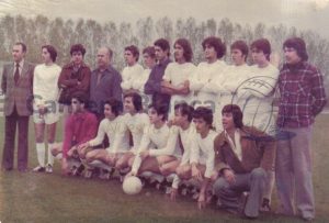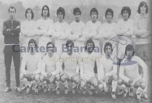 Arriba, SERNA (José Antonio Serna Santos), MARTÍN (Miguel Ángel Martín Madrazo), LUENGO (Ángel Luengo Garro), GONZÁLEZ (Alfredo José González Montaño), PEDRAZO (Juan Francisco González Pedrazo), SERRANO (Miguel Ángel Serrano Sierra), Sr. Juan Gea Álvarez (entrenador), GARCÍA (Gregorio García Fernández), EMILIANO (Emiliano López Serrano), LÓPEZ PÉREZ (José Alberto López Pérez), ROMERO (Ángel Luis Romero Parra)