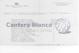 Sentados, de izquierda a derecha, PÉREZ YUSTE (Alberto Pérez Yuste), ARIZA (Juan Luis Ariza Rodríguez), CASTRILLO (Miguel Castrillo Haavardsholm), GINÉS (Eduardo Fernández Ginés), DE LA CRUZ (Francisco J. Pérez de la Cruz), HERNANDO (Víctor Hernando Jerez), GÓMEZ (Santiago Gómez García), RODA (Antonio Ignacio Roda Melgar), MIANA (Francisco Javier Miana Ortega), CASAS (Enrique González Casas), MORENO (Jesús García Moreno), PEQUE (Juan Carlos de las Heras Pons), LOSADA (Sebastián Losada Bestard), FREDY (José Alfredo Díez Abejón), JOSITO (José Antonio Rodríguez Rodríguez), VILLALBA (Carlos Rodríguez Villalba)