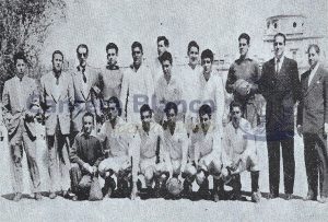 Arriba, Sr. x ( ), Sr. José Morales Berriguete «Moleiro» (entrenador), Juan Antonio Ipiña Iza (Delegado de Fútbol), SASTRE (Francisco Sastre Muñoz), GRACIA, BAIGORRI, EXPÓSITO, CORTÉS (Fernando Cortés Palacios), CAMPOS (Roberto Campos Gil), FREIRE, Sr. Prudencio Sánchez Fernández «Pruden (médico), Sr. x