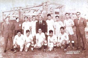 Arriba, Sr. Manuel Pardiña (delegado), RIVAS, ARIAS, CASTAÑOS, Sr. Heliodoro Ruiz Arias (jefe de la sección), ADEVA, PEÑA, PASCUA, Sr. Carlos Sorasu (entrenador)