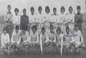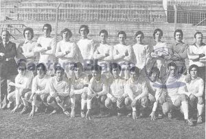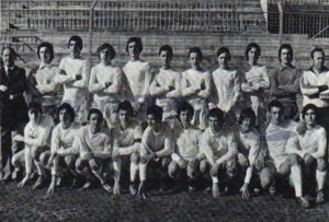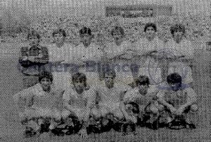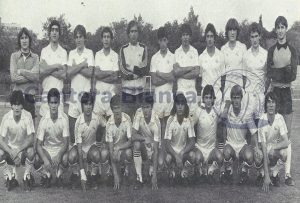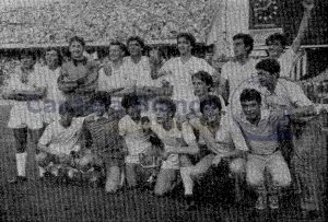 De pie, DÍAZ PÉREZ (-), MATEOS (-), Sr. José Luis San Martín Rey (entrenador), ORDÓÑEZ (Antonio Ordóñez), LOZANO (Emilio Lozano Martínez), VALDENEBRO (José Antonio Valdenebro Manso), GILABERT (Francisco Javier Gilabert Sánchez), SÁNCHEZ MARTÍNEZ (Manuel Sánchez Martínez), R. CASTELL (Luis Rodríguez Castell), DEL BARRIO (Emilio del Barrio Ruiz)