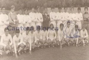 Arriba, POMBO (Luis Pombo Lanza), RUBIO (Antonio Rubio Serrano), GARCÍA VILLALBA (Alberto García Villalba), TITO (Antonio Sánchez García), GÁLVEZ (Pedro Gálvez López), LOZANO (Emilio Lozano Martínez), Sr. Ramón Moreno Grosso (entrenador), MORALES (Carlos Morales Luengo), MÍCHEL (José Miguel González Martín Del Campo), ARGENTA (Juan Carlos Fernández Argenta), MARTOS (Juan José Jiménez Martos), DE MIGUEL (Ángel Luis de Miguel García), AGUILERA (Javier Aguilera Gumpert).