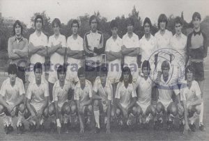 Arriba, Sr. Juan Gea Álvarez (entrenador), BOLÓS (Miguel Bolós Andión), VALDENEBRO (José Antonio Valdenebro Manso), AGUILERA (Javier Aguilera Gumpert), ARROYO (Ángel Arroyo Romera), DOMÍNGUEZ (Justo González Domínguez), GONZÁLEZ (Luis González Garrido), Sr. Antonio Arias (delegado)