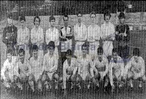 Arriba, ALÍA (José Andrés Alía Malta), VALDENEBRO (José Antonio Valdenebro Manso), MARTÍN (Ángel Martín González), COSTA (Antonio Costa Ortega), Sr. José Antonio Grande Cereijo (entrenador), SOLER (Luis Soler Mínguez), SOLANA (Jesús Ángel Solana Bermejo), RUIZ (Roberto Ruiz Cruzado), SÁNCHEZ (Manuel Sánchez Martínez), DIEGO (Diego Morales Oliva), DEL BARRIO (Emilio del Barrio Ruiz)