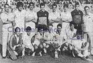 De pie, Sr. Manuel San José Calvo (delegado), ROMANO (Jesús Romano Padilla), VALDENEBRO (José Antonio Valdenebro Manso), MATEOS (-), CASTELL (Luis Rodríguez Castell), GILABERT (Francisco Javier Gilabert Sánchez), MARTÍN (Ángel Martín González), RIVAS (-), FERNÁNDEZ (José María Fernández Delgado), ORSÍ (-), Sr José Luis Rodríguez Laborda (entrenador).