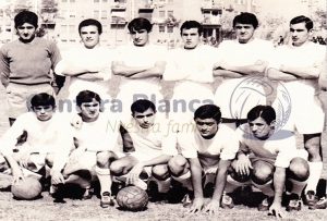 De pie, GARCÍA REMÓN (Mariano García Remón), SÁNCHEZ SANZ (Jesús Sánchez Sanz), RUIZ (Manuel Ruiz Fernández), PEPETE (José Gil Ibáñez), AMÉZAGA (Francisco Javier Amézaga Azcárate), CORELL (Juan Ramón Corell Planelles), LARA (Antonio Sanz Lara) (portero suplente)