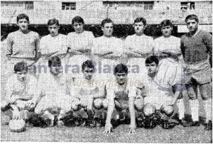 Arriba, GARCÍA REMÓN (Mariano García Remón), SÁNCHEZ (Jesús Sánchez Sanz), RUIZ (Manuel Ruiz Fernández), PEPETE (José Gil Ibáñez), AMÉZAGA (Francisco Javier Amézaga Azcárate), CORELL (Juan Ramón Corell Planelles), LARA (Antonio Sanz Lara) (p.s.)